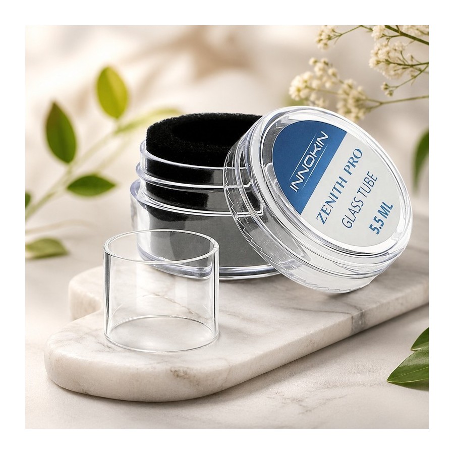 Pyrex de remplacement pour le clearomiseur Zenith Pro d'Innokin. Format bulb (bombé) de 5,5 ml pour remplacer le pyrex standard de 4 ml inclus dans le kit — il augmente la contenance du réservoir. En cas de casse du verre ou pour passer à plus grande capacité, ce pyrex s'installe sans outil en quelques secondes. ⚠️ Compatible exclusivement avec le Zenith Pro Innokin.