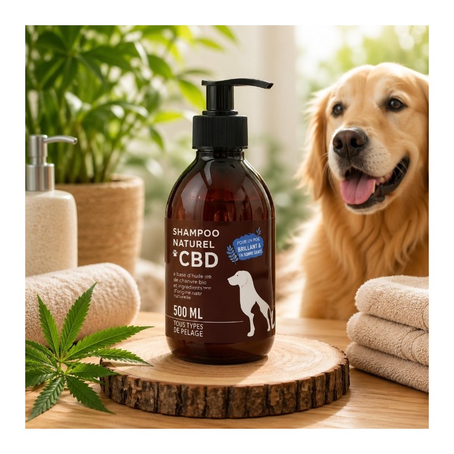 Le shampoing CBD pour animaux à peau sensible. Formule 3 ingrédients, pH neutre, sans conservateur.