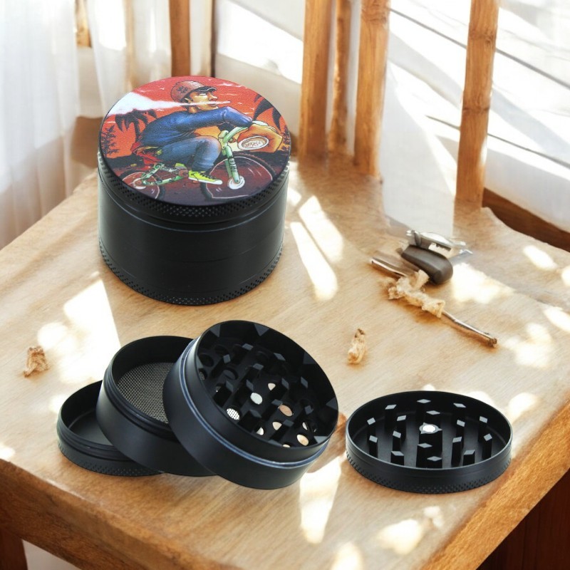 Le Grinder Beuz Bike est un broyeur en aluminium anodisé de la marque bretonne Beuz, avec motif BMX gravé. 4 parties : couvercle aimanté avec grip anti-dérapant, chambre de broyage, tamis filtrant et récupérateur de pollen (kief). 24 dents en acier disposées en losange pour un broyage précis. Livré avec une spatule.