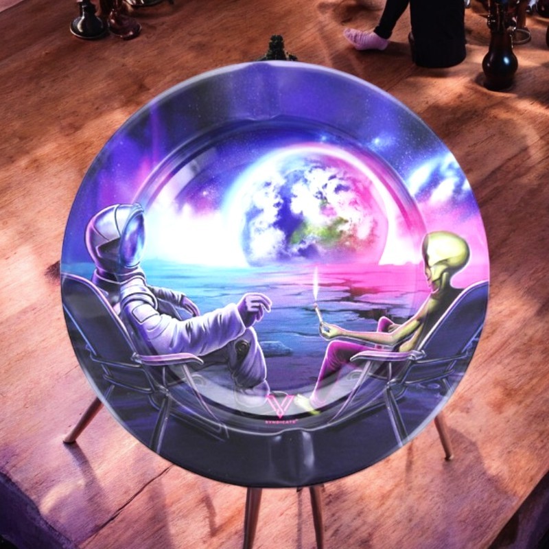 Cendrier en métal de la marque V-Syndicate avec le design Blunt Orbit — alien et astronaute au cœur de la galaxie. 4 encoches pour poser les cigarettes. Solide, compact et facile à nettoyer. Assorti à la boîte de rangement de la même édition.
