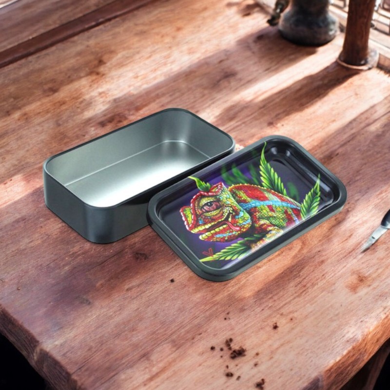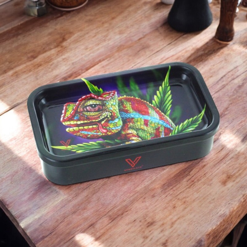Cendrier en métal de la marque V-Syndicate, avec le design caméléon coloré. 4 encoches pour poser les cigarettes. Compact, léger, facile à entretenir. Assorti au plateau et à la boîte de la même édition.