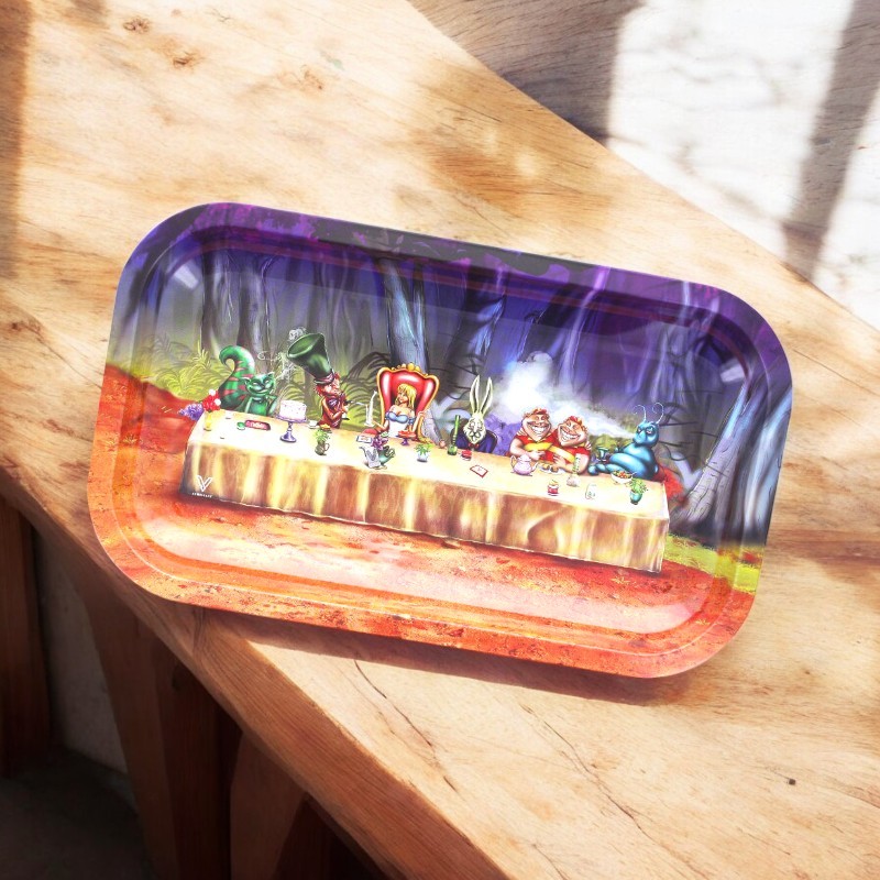 Plateau de roulage en métal de la marque américaine V-Syndicate, avec un design illustré inspiré de l'univers d'Alice au Pays des Merveilles. Rebords surélevés pour travailler proprement sans perdre de matière. Robuste, léger, facile à nettoyer.