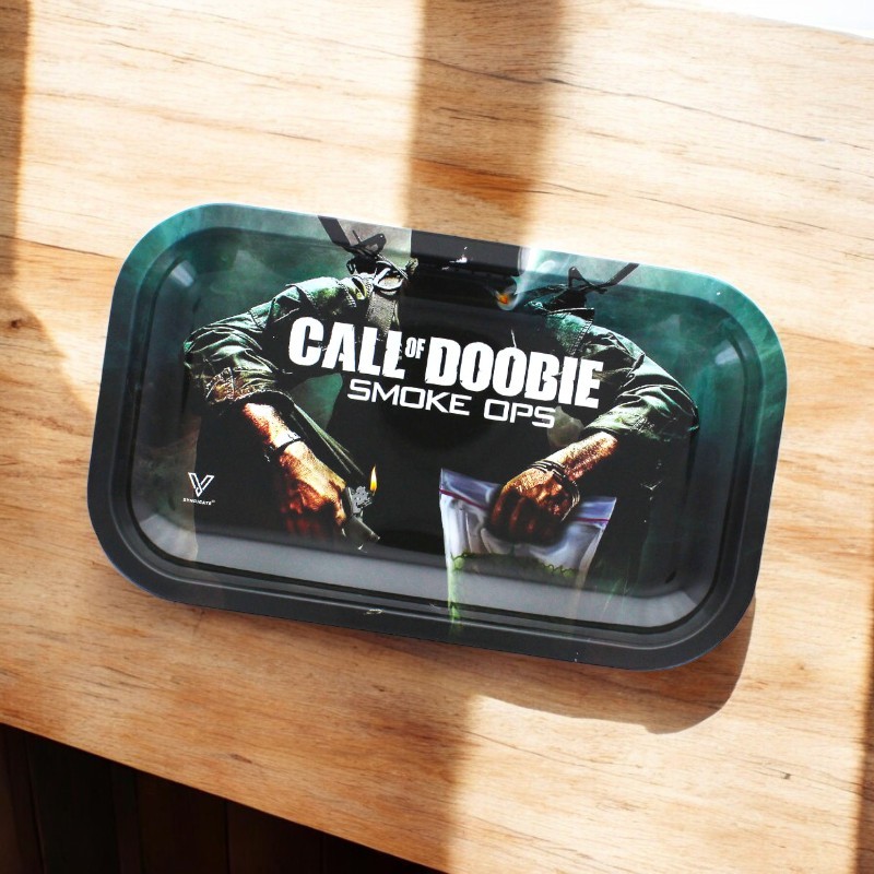 Plateau de roulage en métal de la marque V-Syndicate, avec le design parodique Call of Doobie inspiré du gaming. Rebords surélevés pour un roulage propre sans perte de matière. Léger et solide, facile à nettoyer. Disponible en petit modèle (~18 × 14 cm) selon stock.