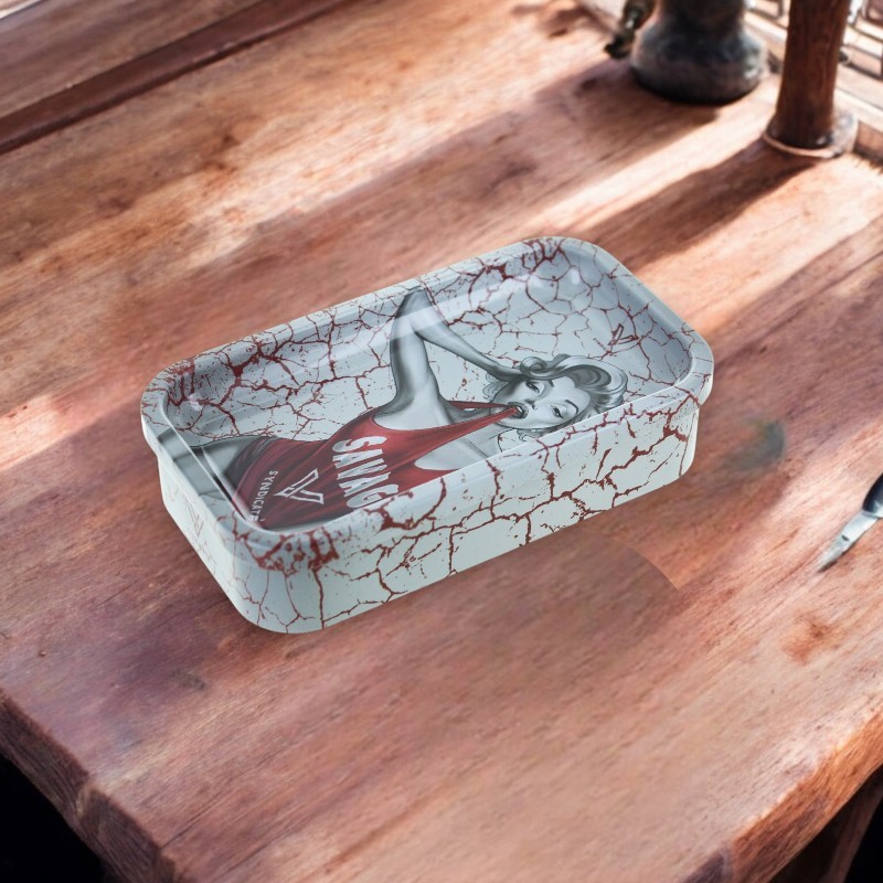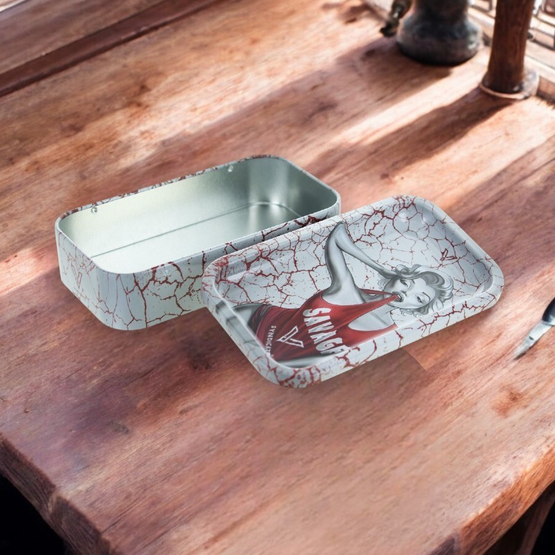 Boîte de rangement en métal V-Syndicate, anti-odeur et imperméable, avec le design Dank Diva. Le couvercle incurvé se transforme en mini plateau de roulage. Idéale pour ranger feuilles, filtres et briquet en un seul endroit compact et discret.