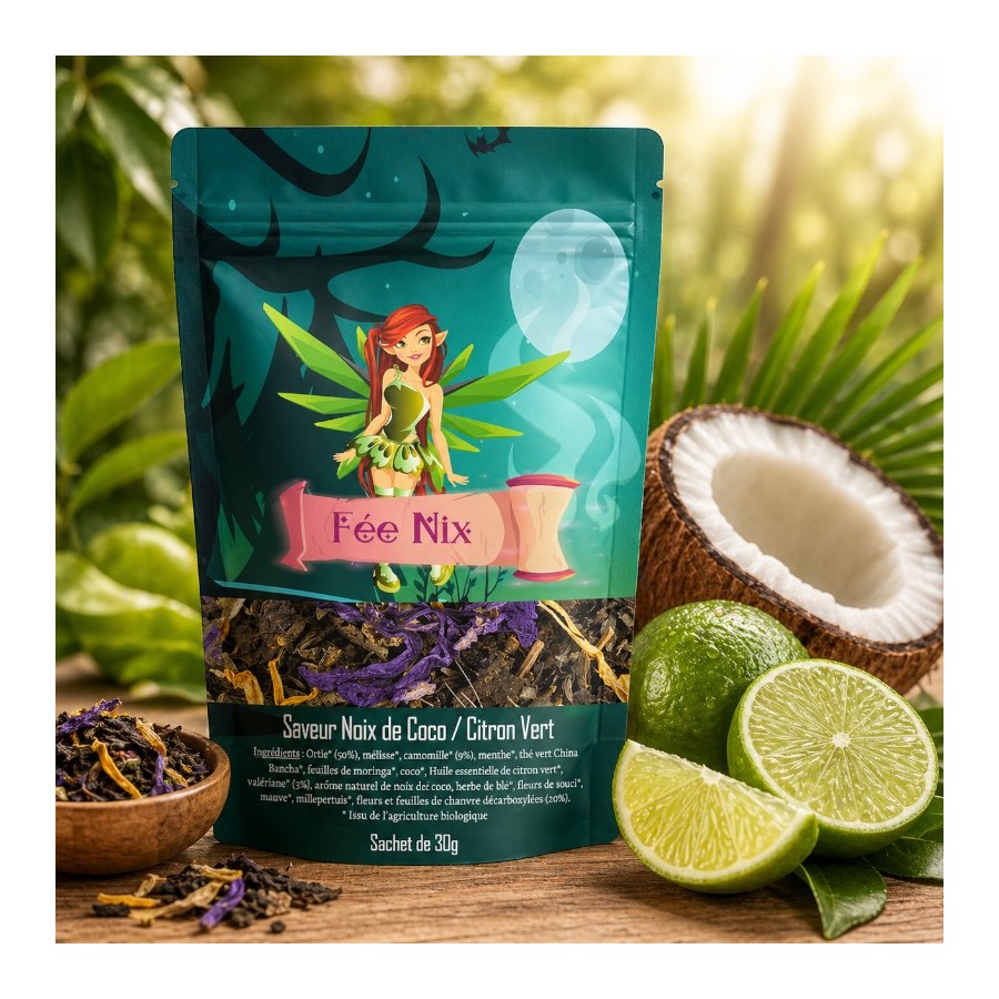 Fée Nix déborde d'enthousiasme mais elle a la fâcheuse tendance à passer d'une tâche à l'autre sans jamais en finir une. Pour s'offrir une pause rafraîchissante au milieu de tout ça, elle a concocté une infusion légère à la noix de coco douce et au citron vert vivifiant.