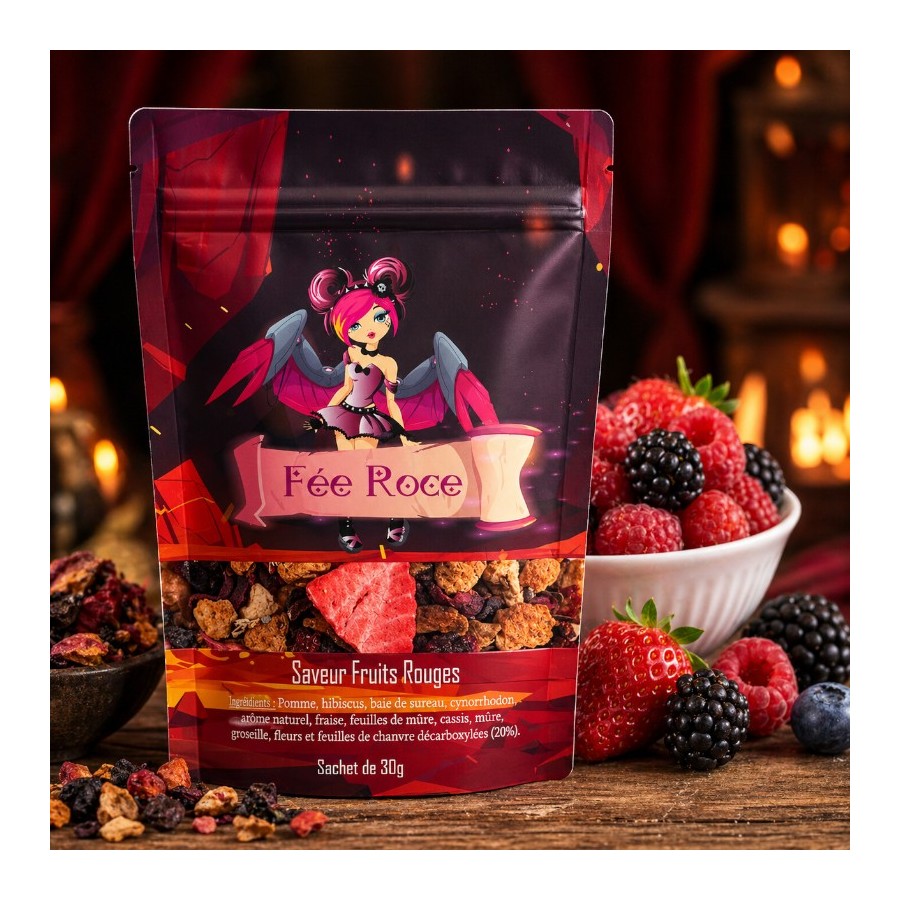 Pomme, hibiscus, baie de sureau, cynorrhodon, fraise, feuilles de mûre, cassis, mûre, groseille — et 20 % de fleurs et feuilles de chanvre décarboxylées.